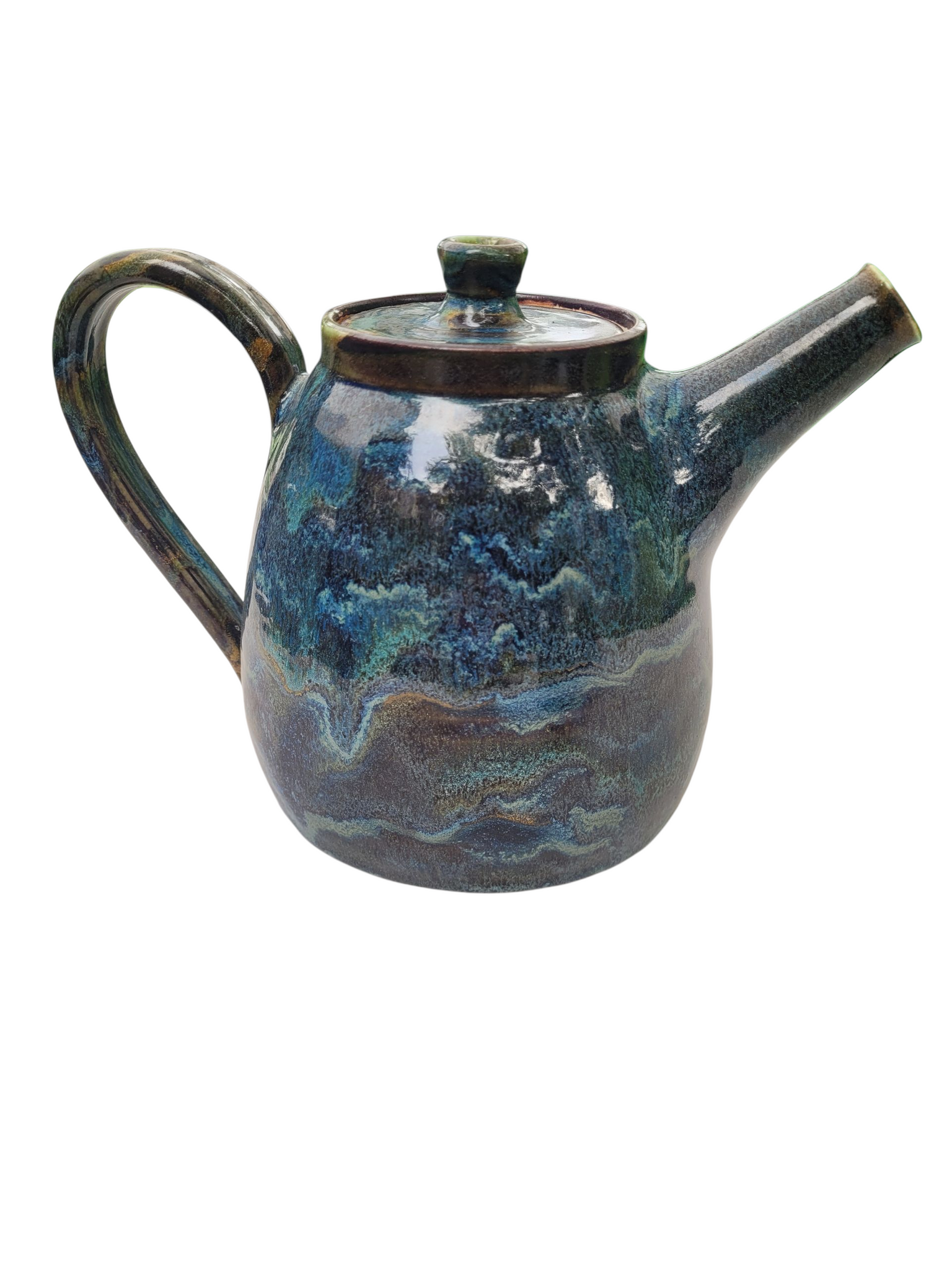 A medium teapot in the Tofino glaze line. It holds about 4 cups of liquid and stands about 7" tall.